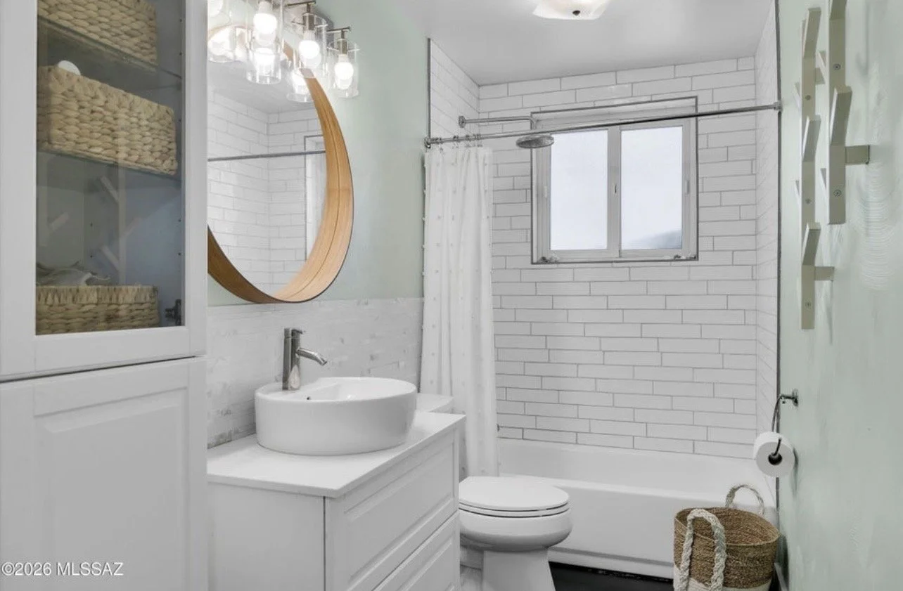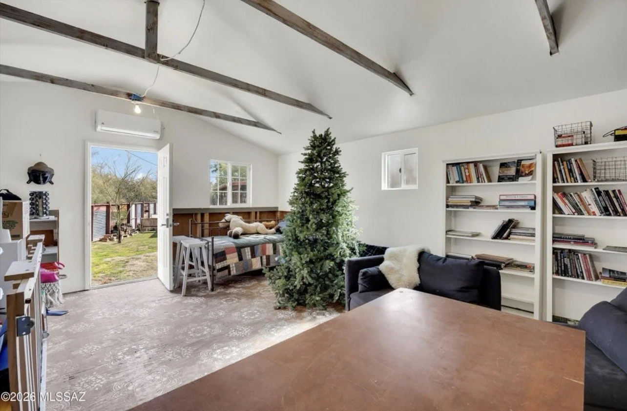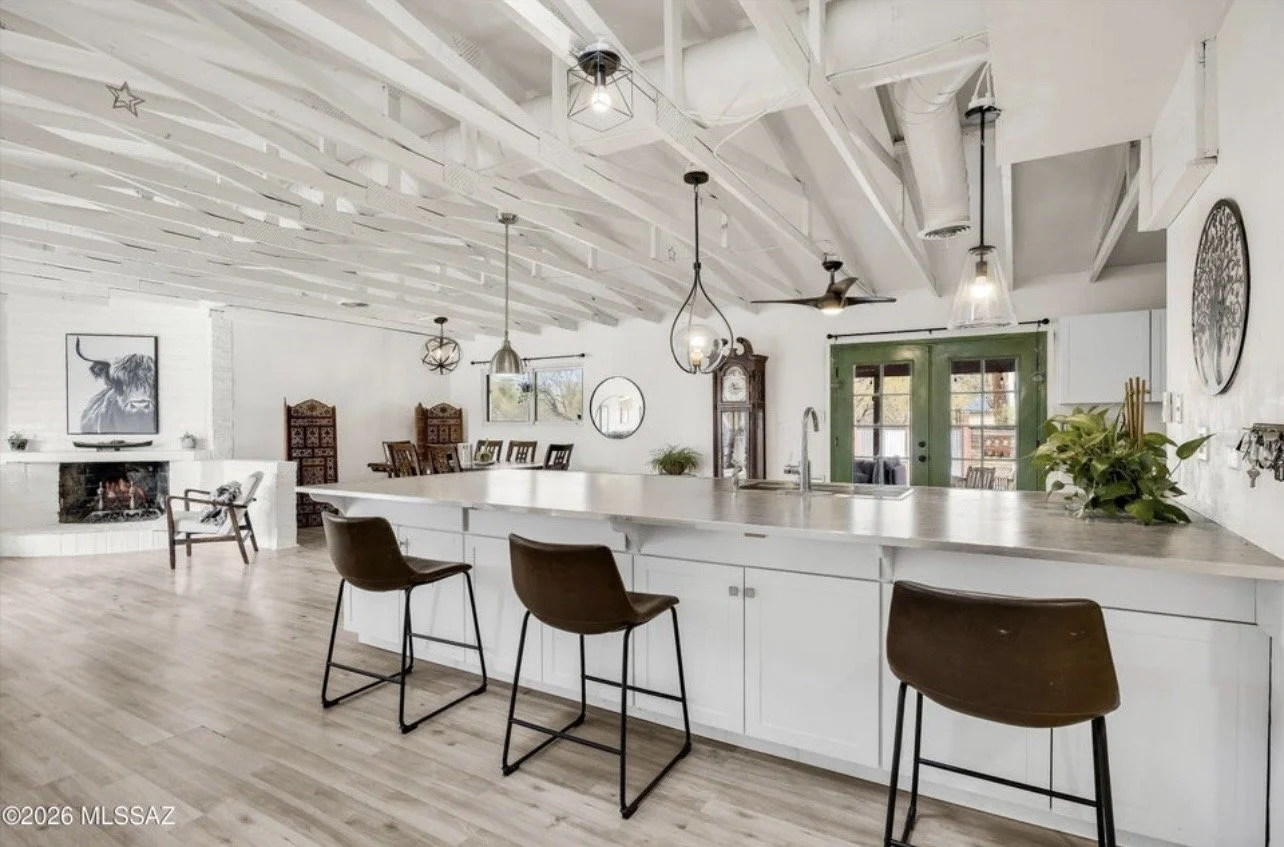 Located in the historic Indian Ridge community and built by renowned Lusk Builders, this charming home blends mid-century character with thoughtful modern updates. The open layout is anchored by a cozy wood-burning fireplace, ideal for everyday living and entertaining. The kitchen features white shaker cabinetry, ample storage, a pantry, and a statement island, while newer luxury vinyl plank flooring throughout creates a clean, contemporary feel. The primary suite opens to a private patio with Catalina Mountain views, and a temperature-controlled office/workshop/studio (not included in the square footage) adds valuable flexibility. Additional updates include exposed joist ceilings, electrical improvements, and a custom artist-designed fence.